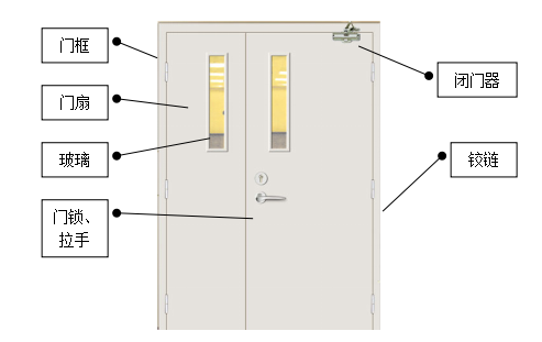 防火門是指在一定時間內,連同框架能滿足耐火穩定性、完整性和隔熱性要求的門。防火門的主要部件包括門扇、門框、玻璃、門鎖、拉手、鉸鏈和閉門器等。